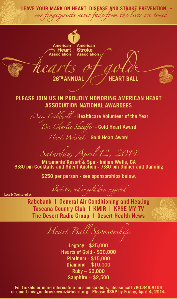 Take the first step by attending the upcoming Heart Ball on Saturday, April 12, 2014. Please see the invitation below. To RSVP, please contact Meagan Bruskewicz at meagan.bruskewicz@heart.org or 760-346-8109. If you have questions on how to further get involved, please contact Cindy Stillman, Executive Director at cindy.stillman@heart.org or 760-791-7164. Sincerely, Steve Weiss |