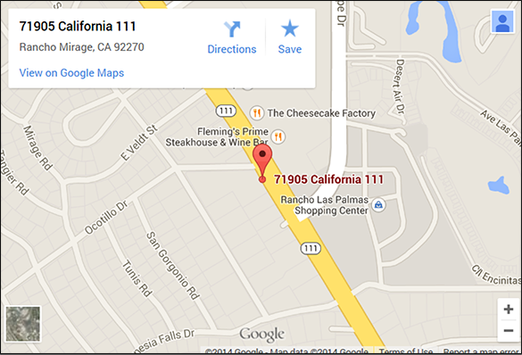 Located across from The River at the corner of Highway 111 and Ocotillo Drive in Rancho Mirage in the Lamps Plus building. Turn on Ocotillo Drive and take an immediate left into the parking lot. The entrance is also located on the back of the building. See below for map and click View on Google Maps or Directions for driving directions.
